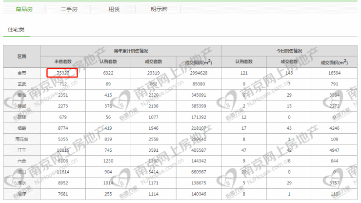 但目前南京新房库存仍在7.5万套的高位,而去年同期是6万套库存。