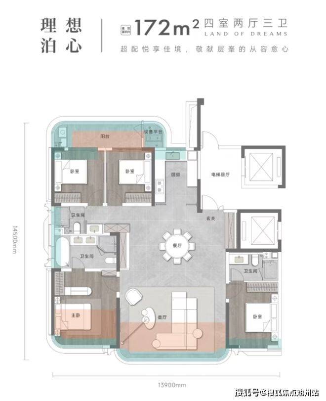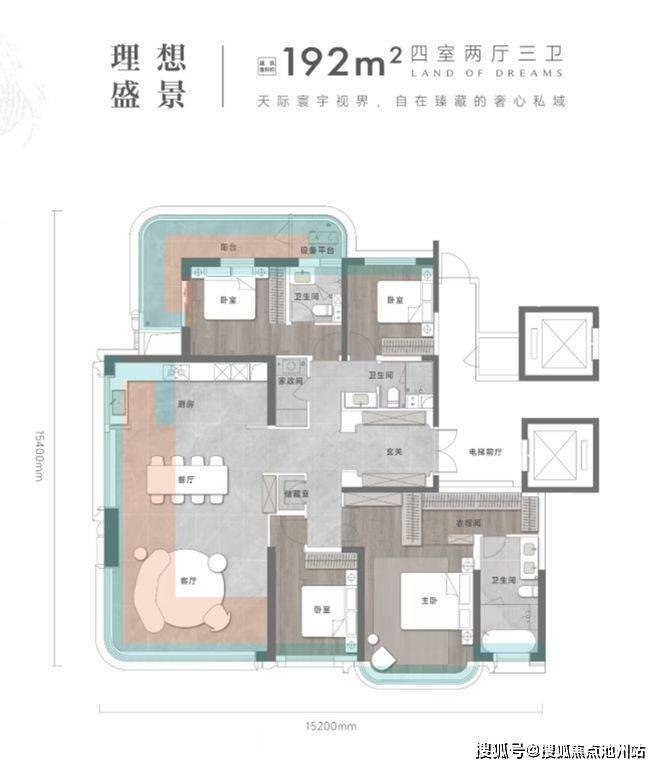 从户型图设计可以看到,小区用了大量的弧线设计,北向阳台、南向主卧、客厅都是270°弧形设计,视野采光会非常不错,每个户型,都设计了北向阳台,可以解放南向阳台的家政功能,所有户型都是LDKB一体化,主卧套房全部朝南,而且这两栋楼,南向是学校的低层建筑,采光视野都非常好。