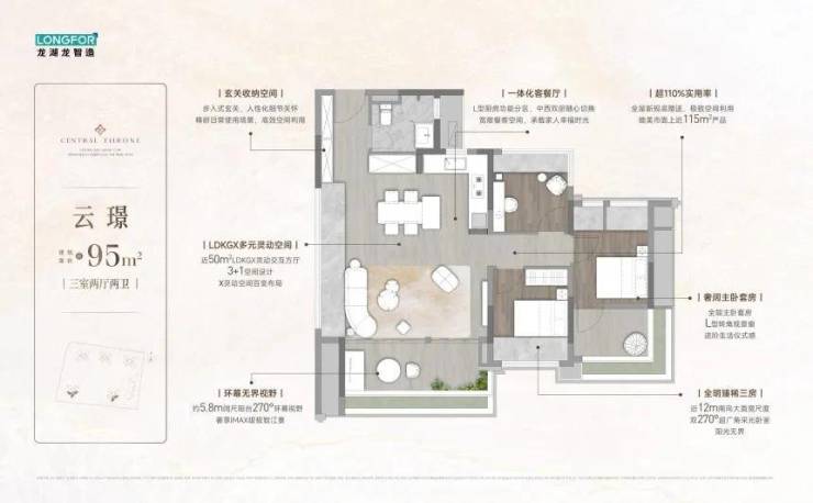 95㎡三房采用 LDKG 一体化设计,公共空间更开阔,5.8 米的巨幕阳台搭配 L 型飘窗,采光和观景都比较好。