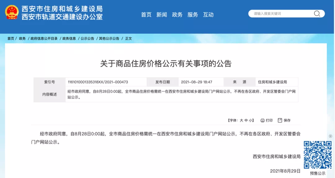 8月29日,西安住建部发布通知:从8月28日0:00起,全市住房价格不再由各区政府、开发区管委会门户网站公示;改由西安住建局网站公示。