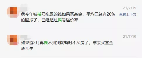 一叶落可知天下秋。实际上,从今年下半年开始,部分自住需求不是特别急迫的购房者,就开始变得理性:“现在普通摇号者平均低于5%的摇号率,久摇不中的购房者真金白银白白无利息拖在那里一两年,也是一种杀猪……”“我今年被摇号拖累的钱如果买基金,平均已经有20%的回报了,已经超过摇号溢价率,如果这2月再摇不到我就暂时不买房了,拿去买基金放几年。”