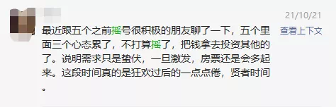 作为楼市的看客,大部分的目光都集中在摇中者的身上:天选之子、A类人才、社保巨子……然而这类人总是少数,占比较大的那些久摇不中的“分母”,有些人已经开始改变想法:在楼市预期下降的背景下,将一大笔资金投入楼市真的合适吗?有部分原来摇得很积极的小伙伴,最近开始动摇了。“最近跟五个之前摇号很积极的朋友聊了一下,五个里面三个心态累了,不打算摇了,准备把钱拿去投资其他的。说明需求只是蛰伏,一旦激发,房票还是会多起来。这段时间真的是狂欢过后的一点点倦,贤者时间。”
