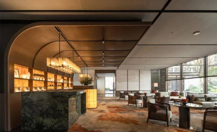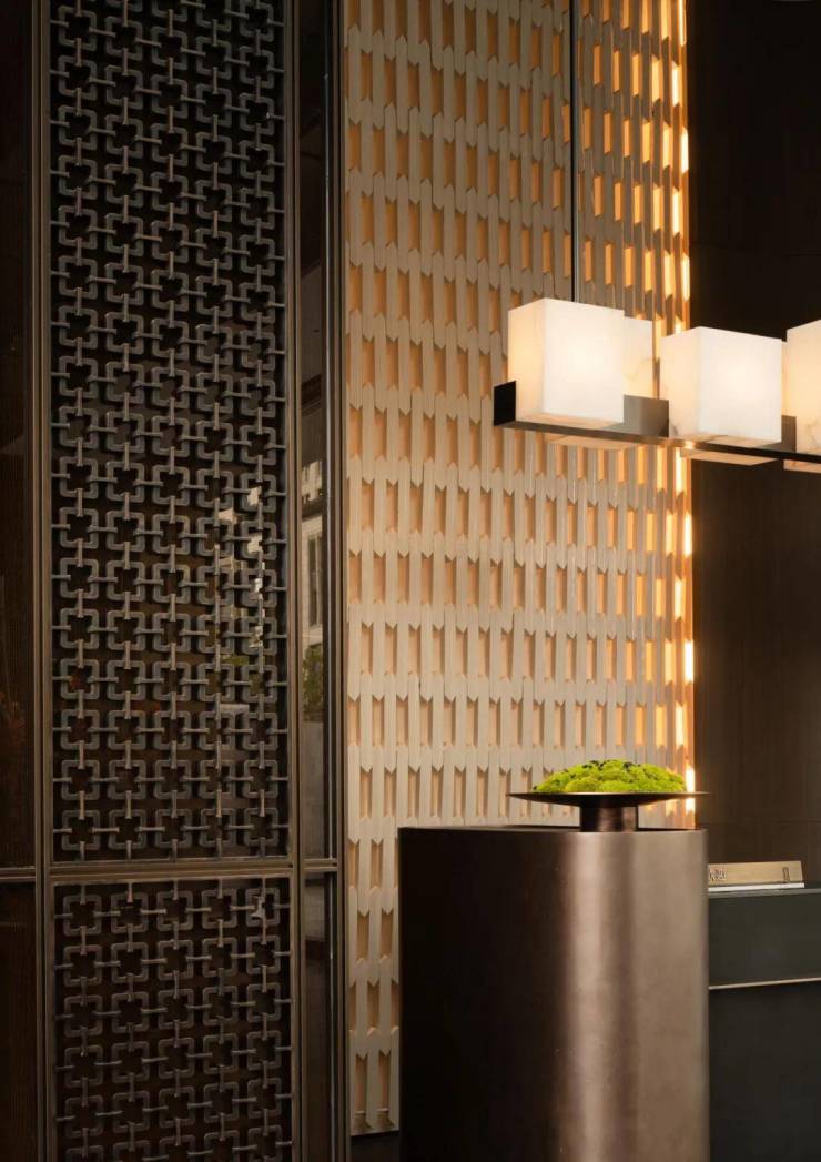 “山欲高,尽出之则不高;烟霞锁其腰则高矣。水欲远,尽出之则不远;掩映断其脉则远矣。”国人讲究含蓄、朦胧之美,丹枫水院将山水美景置于框中,是为框景;琉璃水院,浮光廊两侧,是为对景;将冬青、乌桕,橄榄绿、菲油果、铁冬青等近百种植物以及山石、瀑布叠水引入园中,是为借景;透过套方锦纹花格屏风窥见园中景色,是为漏景;黑山石、蟒水纹金属贴片朦胧之下,让人觉得意犹未尽,是为障景。海上瑧悦运用多种组景手法,一山一水,一花一木,步移景异,无不体现层次之美,动态之美。