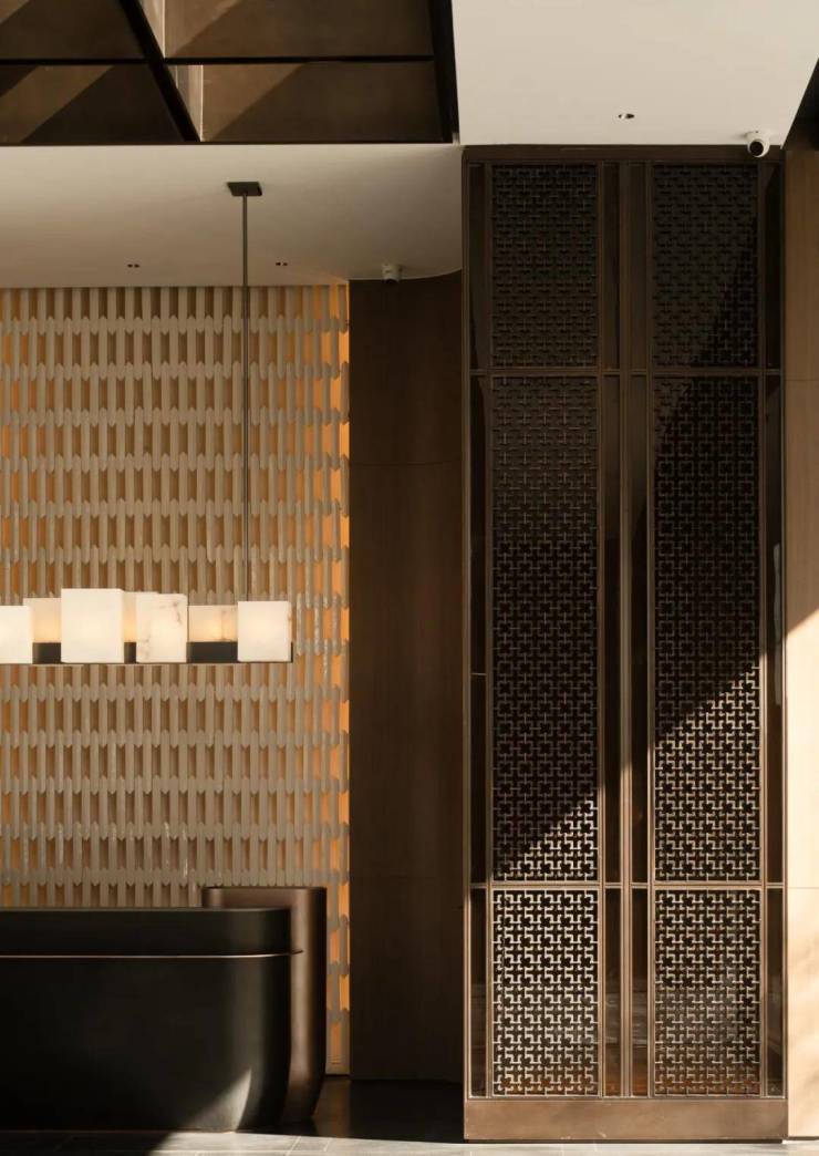 古人言“宅以门户为冠带”,门是一种礼仪制度的象征,更是宅第品格修养的表现。海上瑧悦,单元门头整体和小区入口大堂呼应,两侧采用大象灰石材哑光面和拉槽面,门头金属条纹的细密程度拿捏地恰到好处,在细节和光影设计上做了整体东方格调的把控,层次细腻、典雅大方。