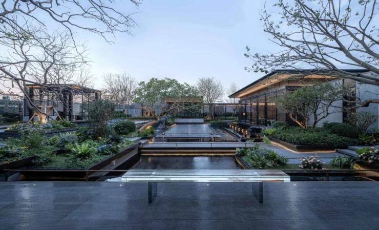 海上瑧悦,中水系形态变化丰富,通过200米、近1000平的静水、跌水、涌泉、瀑布等不同的形态诉说传统东方文化水系的不同寓意。复刻“张园”三大水系的二次营造,围绕楼王布置,贯穿入口、启动区庭院、仪式归家轴线、超级引力中心,形成流动灵活的水系。