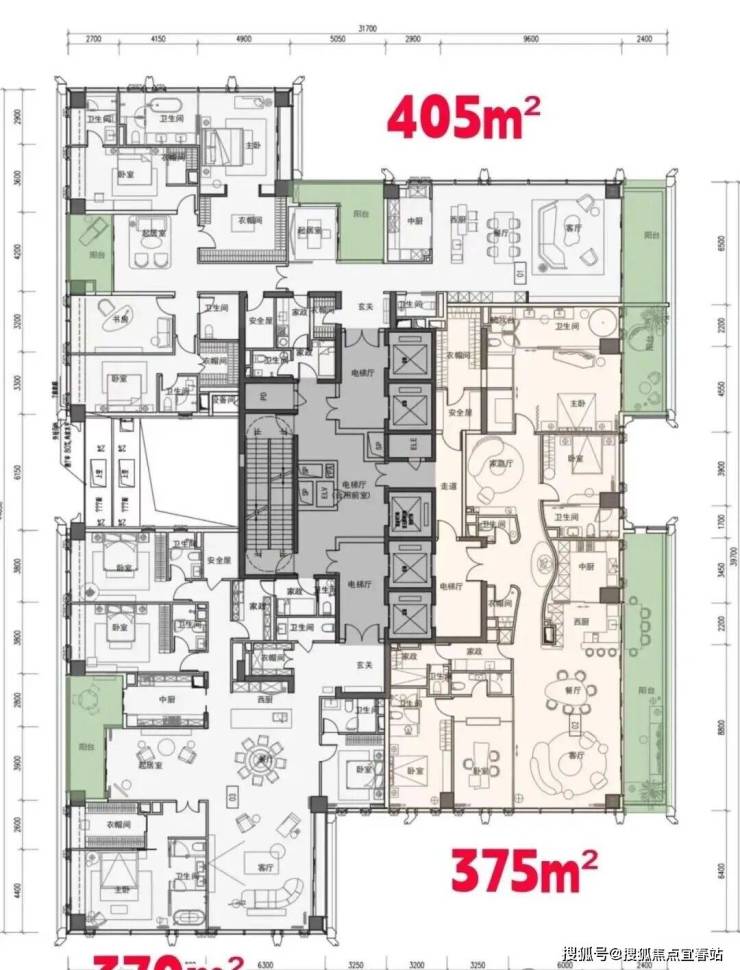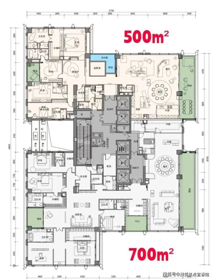 超高区(58层起,200米以上):约500-700㎡顶级大平层。