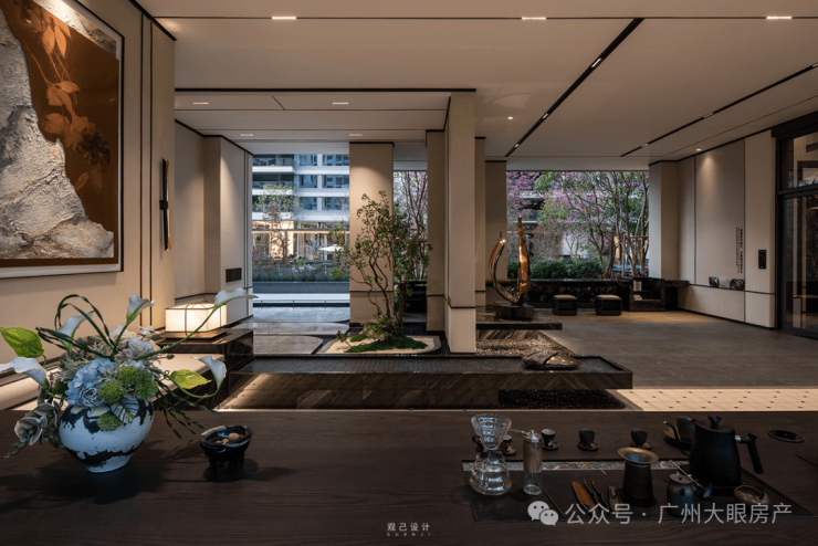 5栋的「云栖·西派艺术馆」 雕塑长廊与立体庭院串联,巧妙地陈设“风”字的金属雕塑、形似层峰叠峦的艺术壁画、融入白云山沉淀的绿宝石。