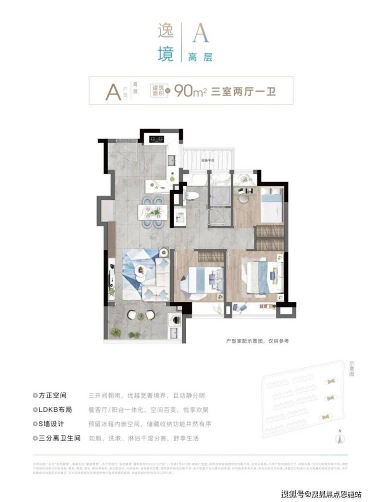 金地嘉境目前主力在售建筑面积约90㎡高层户型,总价约300万起!该户型功能性上做到3房2厅1卫,格局上实现了南北通透+三开间朝南,通风和采光效果非常不错。尤其让人心动的超常规的面宽尺度,大南向开间,视野开阔采光效果佳。