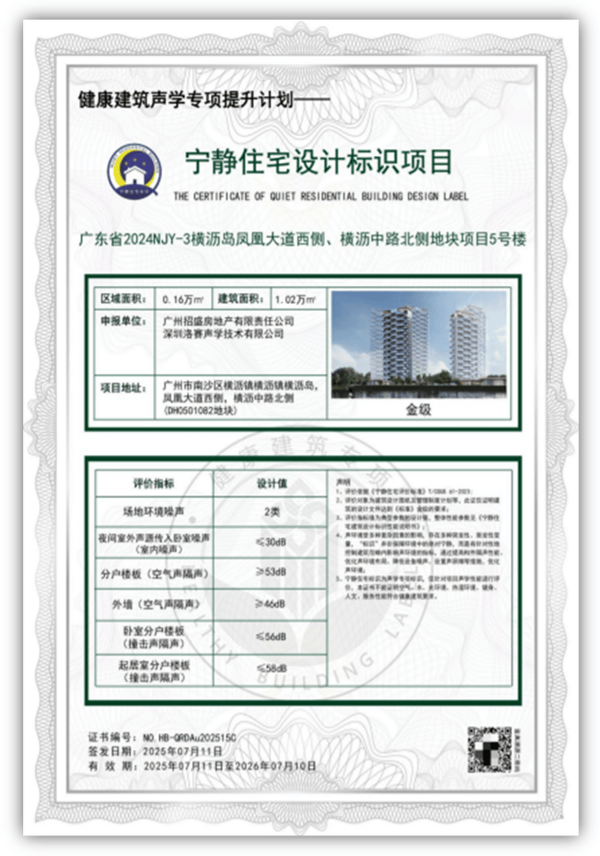 2025年5月初,洛赛声学受招商蛇口广州招盛房地产有限责任公司的委托,为其“招商林屿境项目”提供【宁静住宅评价标识】之“设计金级”的全过程声学咨询与申报服务。
