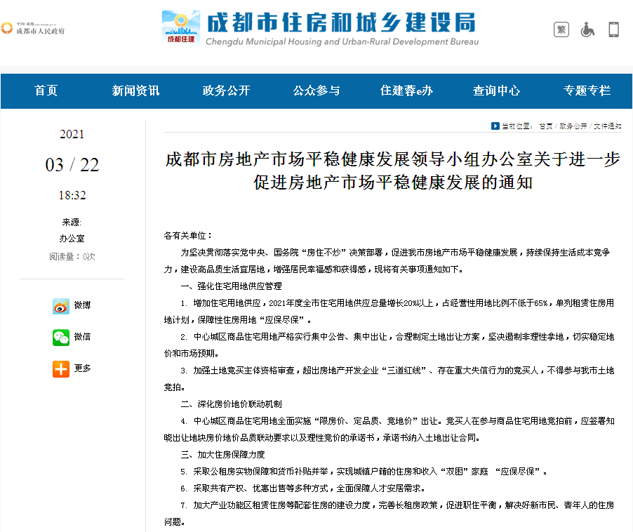 3月22日,《成都市房地产市场平稳健康发展领导小组办公室关于进一步促进房地产市场平稳健康发展的通知》(以下简称《通知》)正式出炉。