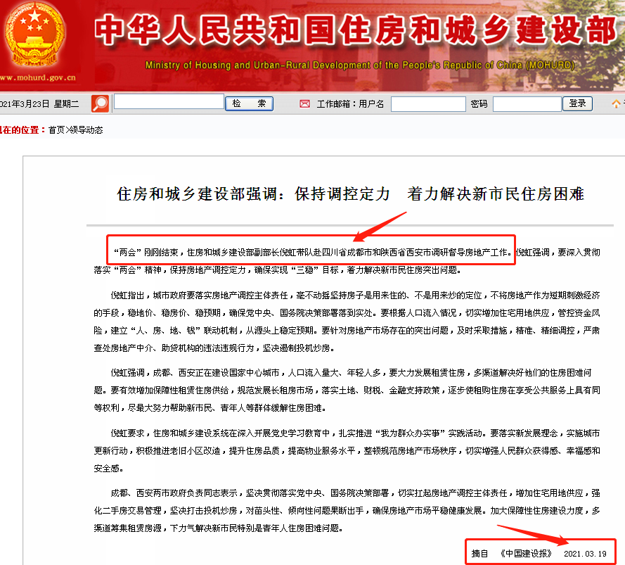 巧的是,根据住建部网站3月19日信息,“两会”刚刚结束,住房和城乡建设部副部长倪虹带队赴四川省成都市和陕西省西安市调研督导房地产工作。