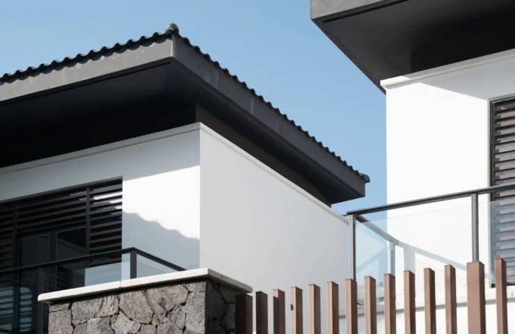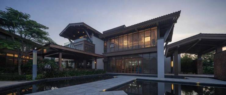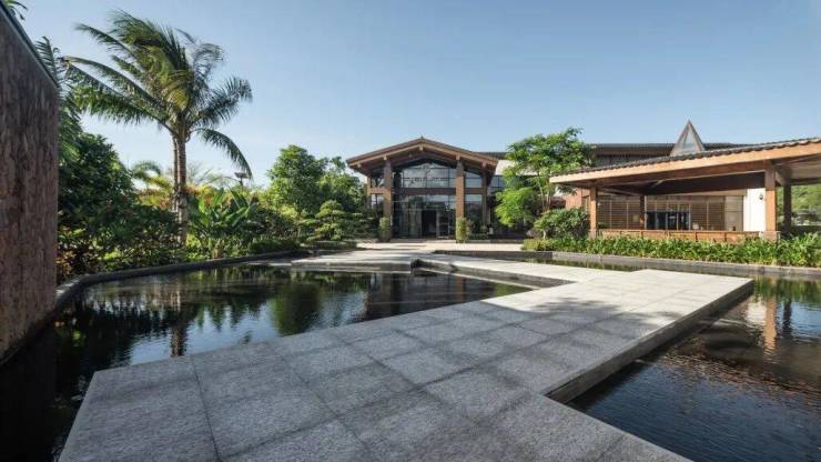 HMD从海南传统村落、街巷、庭院、水口、村头树汲取灵感,将灰色和红色的火山石,和梨花木、椰子树等海南当地木材用于院墙、栏杆、百叶、纳凉亭等,体现传统建筑文化肌理;同时采用坡度缓和的大屋顶大挑檐,体块悬空、大面积开窗的手法,打造通透开敞的空间,令建筑与自然融合。