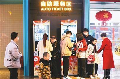 1月22日(正月初一)上午近9时,位于北京朝阳区的耀莱成龙国际影城慈云寺店内老中青少观众齐聚,人流熙熙攘攘,等电梯、打印纸质票和入场检票都需要排队。