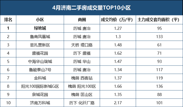 据贝壳济南站调查统计,2021年4月,排在成交量首位的是历城唐冶商圈的绿地城小区,小区成交均价为1.27万/平方米,主力成交套均面积为95平方米。