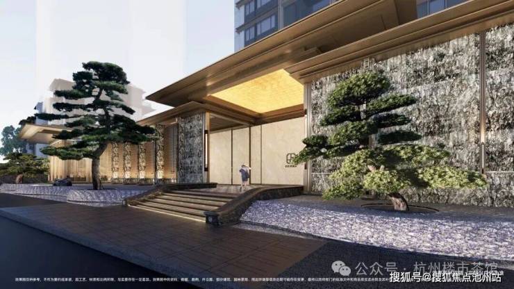 约60米全画幅门庭豁然展开,纳千年风雅于一境。两株超百岁树龄的罗汉松,跨越千里而来,静守世家门楣。金属格栅与天然奢石交织,光影流动间,勾勒出一幅现代东方的诗意长卷——天造一半,人造一半。门庭之上,良渚玉琮纹样化作迎宾重檐,西湖水韵幻为龙鳞叠水。东方符号融入现代构造,诠释世家气度与文化底蕴。