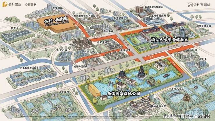 保利·西源赋府所在的保利置业组团,在小范围内是整拆整建的界面,未来建成后属于产居一体的新兴区块,地块东侧零距离蓬驾桥港河,这条与西溪同源的塘河绿道,使项目成为西湖区少有的拥有江河资源的幸运儿。