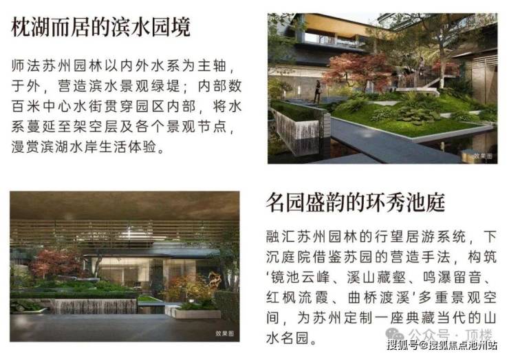 依凭半岛三面水岸的天然资源,以“一堤三面湖”和“水街襟两园”设计笔触,实现滨水互动、开门见水的场景体验;融汇吴门画派、苏州园林造园理念,营造出一座温润如玉的流动庭园。