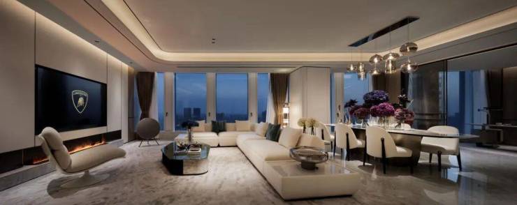 约420㎡“超跑”四房户型,更拥有约14米的公区弧形巨幕面宽,演绎兰博基尼顶级超跑“闪电”的极致型格。