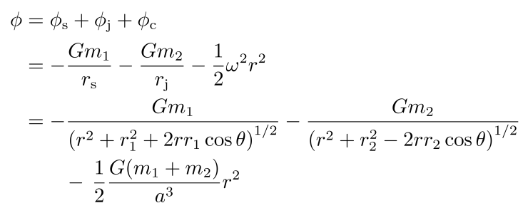在与太阳-木星系统保持静止的旋转参考系上,除了存在太阳、木星的引力势以外,还存在旋转所导致的惯性势。假设宇航器具有单位质量,那么总势为