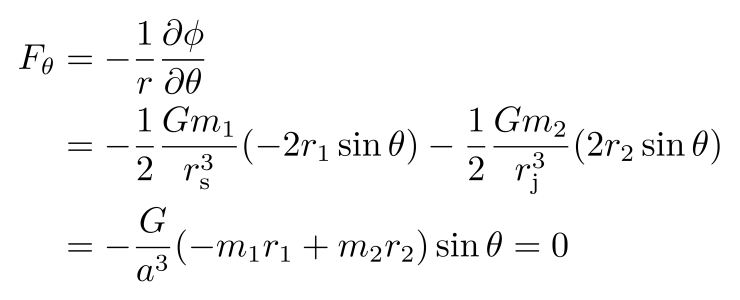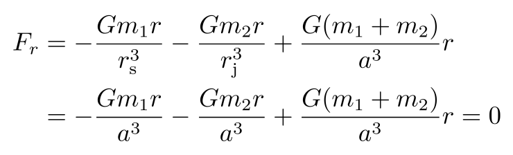 由于径向力与切向力都为零,可见在满足r_s=r_j=a的位置上,质点所受合力确实为零,因此这就是相应的拉格朗日点所在位置。张朝阳进一步强调,这个点并没有处在木星的公转轨道上,这是很多人的误解。只有当太阳质量变得无穷大,太阳-木星系统的质心精确处于太阳中心时,L4点才精确地处于木星的公转轨道上。