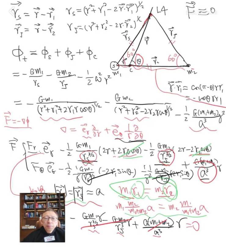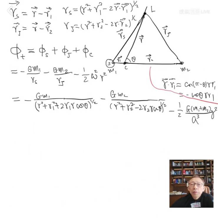直播一开始,张朝阳介绍了本次课程的主要目的,完成跨年演讲时由于时间关系未能细讲的拉格朗日点的推导,其中主要是第四个拉格朗日点(L4)位置的推导。