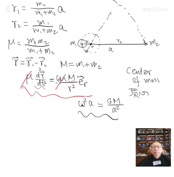 在之前的物理直播课中,张朝阳已经推导过此方程,可以查看相关的直播回放了解。上式等号两边的μ可以被消掉。假设日木系统公转角速度为ω,那么根据上式可以得到