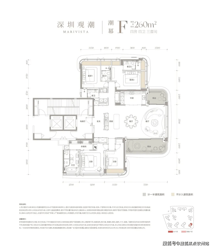 建面约260㎡的户型:四房四卫三套间