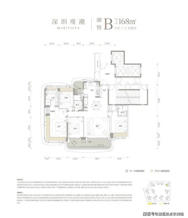 建面约168㎡的户型:四房三卫双套间