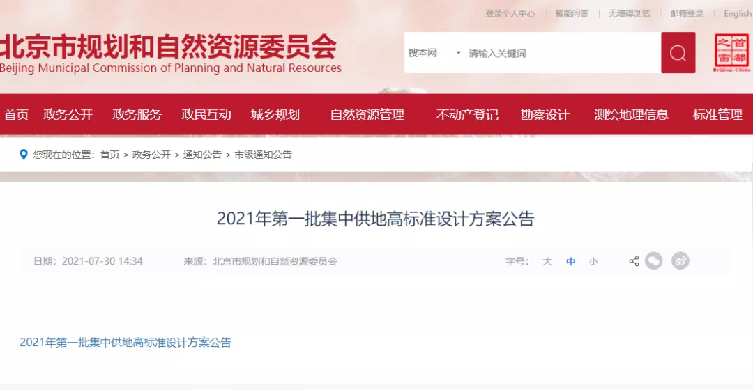 上周五,规自委发布了帝都2021年排名前列批集中供地高标准设计方案公告。