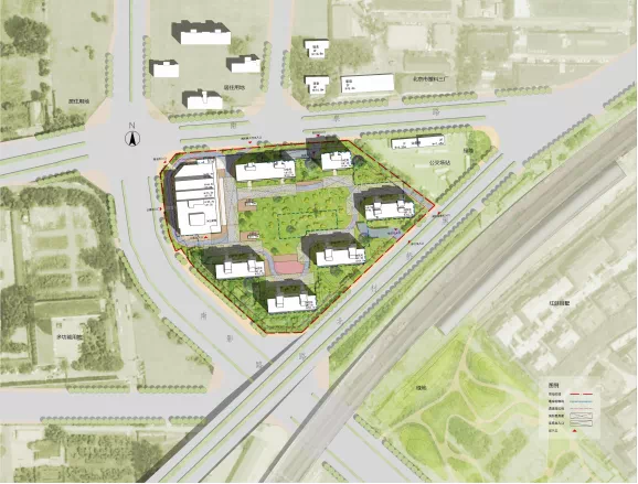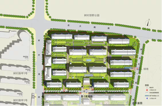 规划中,地块北侧布置口袋公园,西北侧增加城市街角广场,共同形成积极城市公共空间界面,社区由六栋14-18层高板+1栋商业楼组成,合围式排布。