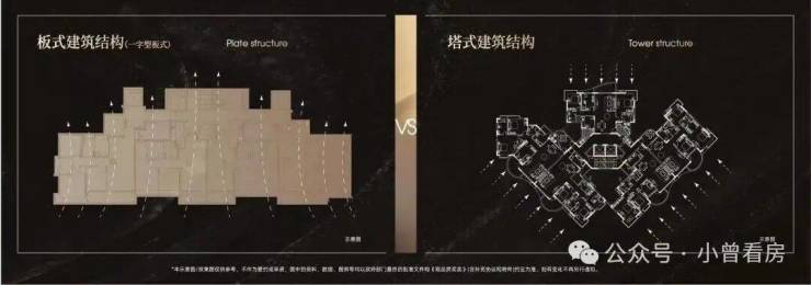 ×塔楼:混合朝向,并非户户朝南,户型间存在遮挡,容易产生对视,室内空气流线差,换气效果相对较差。