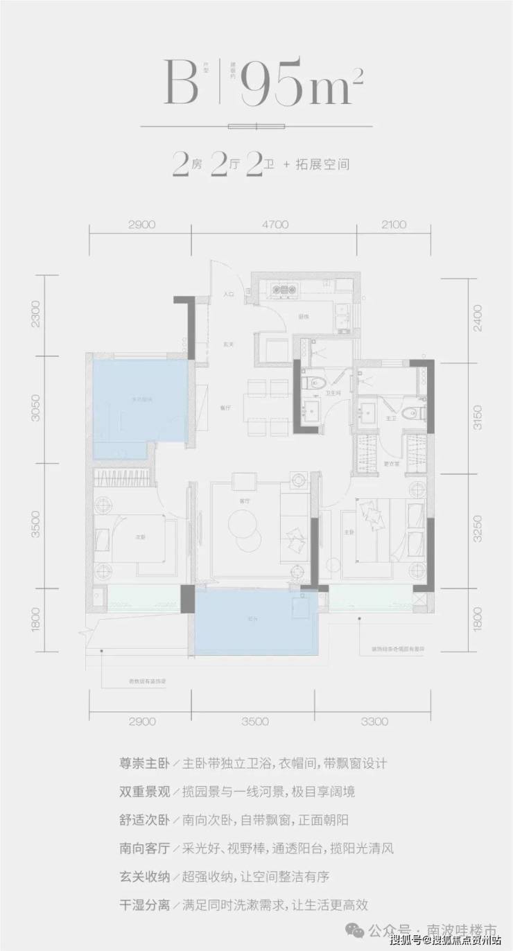 B 户型 —— 建面约 95㎡ 2 房 2 厅 2 卫 + 拓展空间。