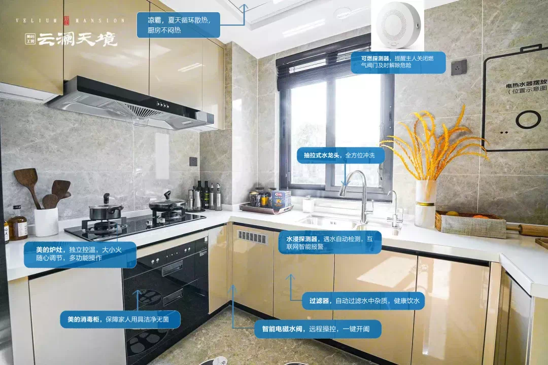 美的工润·云澜天境在厨房贴心设置的可燃气体探测器,在燃气泄露时会立即发出警报,提醒主人关闭阀门解除危险,让做饭的时间也不用慌慌张张,而是从容异常。同时厨房内还设置水浸探测器,遇水自动检测,联动网关智能报警,并可通过手机APP远程操控,一键关闭。