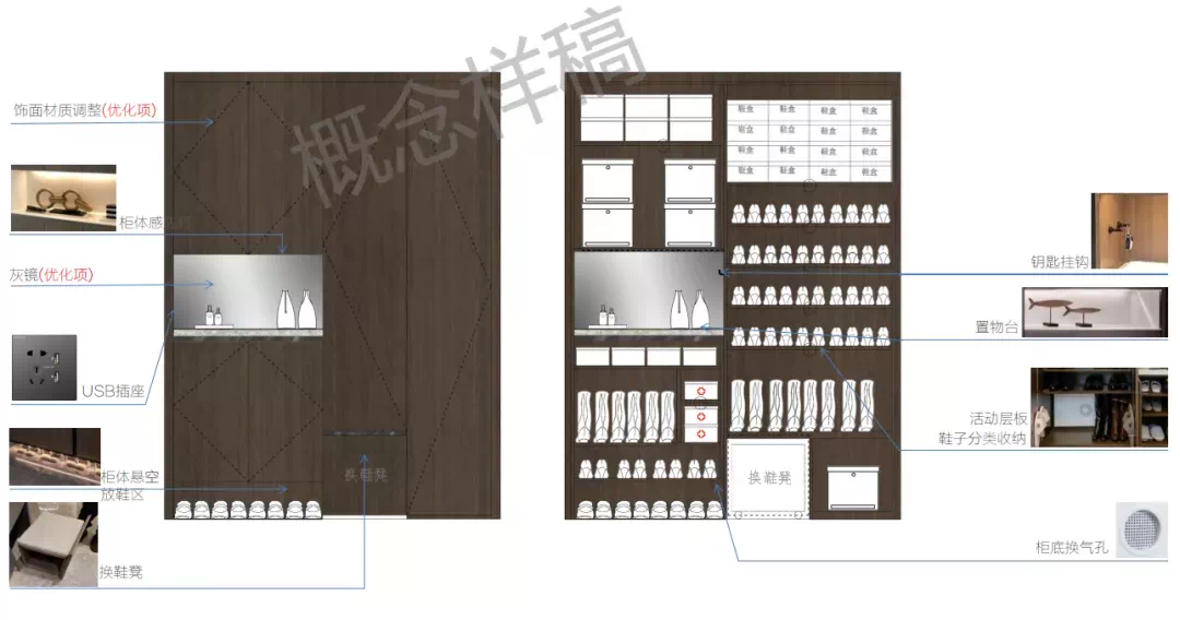 超大的收纳空间,通过移动层板,可安放男主人的潮鞋,可私藏女主人的长靴,从此之后,鞋子再也不怕多!而且空气流通性强,除湿除臭,每天出门,从一双干爽清净的鞋子开始,踏上对梦想的征程。隐藏式的坐凳,亦可以让女主人优雅换鞋。