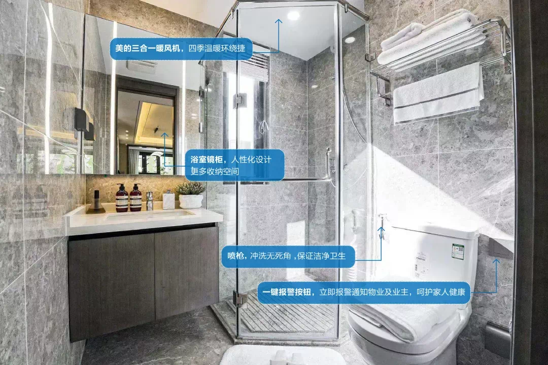美的工润·云澜天境在浴室内打造成品浴室柜,集储藏、洗涤、收纳为一体,配备暖风机,快速升温,浴室整体温度均匀,无暖气季节舒适沐。