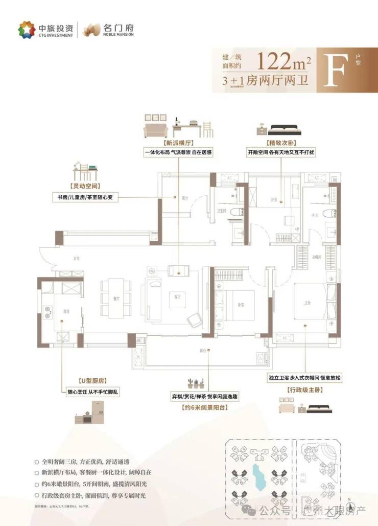 F户型:建面约122㎡3+1房两厅两卫