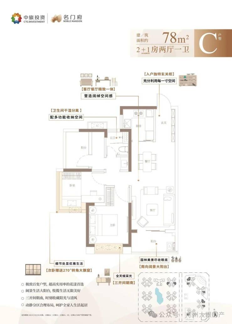 C户型:建面约80㎡ 2+1房两厅一卫