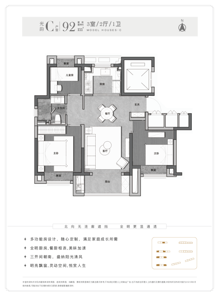 另外这个户型能更好实现南北通透,客厅-餐厅-阳台-厨房一线连通。