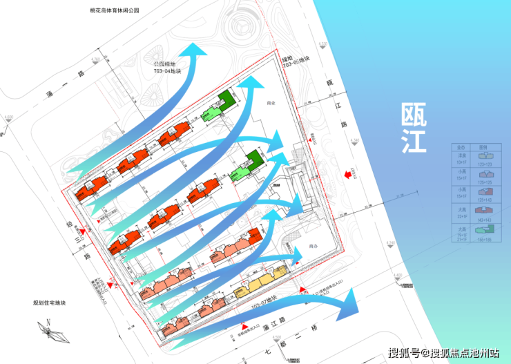 望江所在的地块正处于瓯江西向东南的流向转角,为了最大化利用江景资源,望江采用东偏南的楼栋布局,顺着地块的沿江长边面布置楼栋,这样最大程度的保证既能做大面宽且能最大程度拥有江景,基本实现栋栋瞰江,户户有景。
