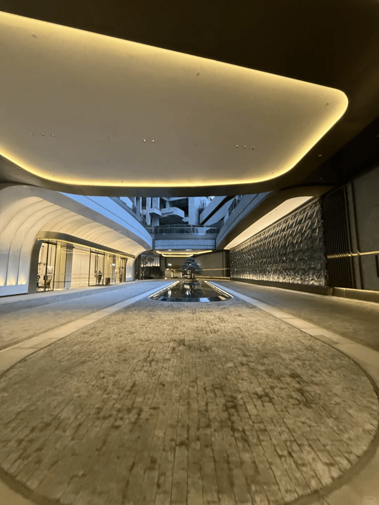 沿街商业界面与超级架空层相辅相成,呈现出一种巧妙的进退互动。深灰色的天然石材与晶莹剔透的玻璃橱窗相互映衬,营造出实与虚的完美交融。黄铜色泽的铝板作为楼层间的视觉焦点,巧妙搭配弧形倒角设计,于细腻质感中彰显人文关怀,为近人尺度带来温馨舒适的体验。