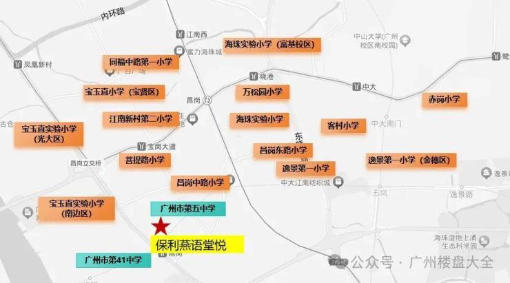 周边还有工业大道中小学、广州市第41中学、广州市第5中学、广州昌岗中路小学(翠城校区)、广州市海珠外国语实验中学附属学校、红棉小学(顺意小区)、海富小学、南燕小学、宝玉直小学(南边路校区)。