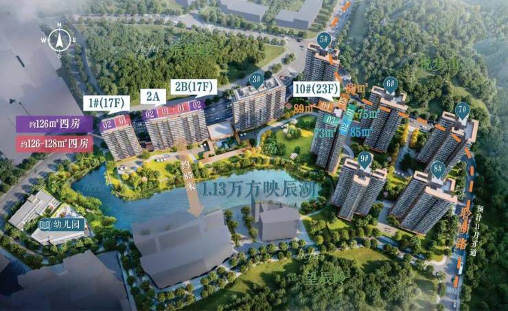 ▸丰厚的湖景资源,环抱映辰湖东西跨度近300米,离湖最近处约40米,专门开辟了私家步道与映辰湖直接相连