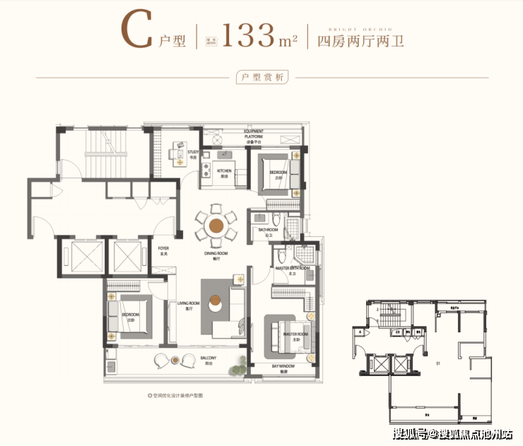 另外一款建面约133㎡户型, 典型的四叶草户型,动静分区,空间过道浪费少。