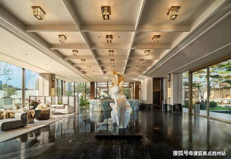 顺着风雨连廊,来到酒店式一楼大堂,中间设计了一个艺术雕塑。