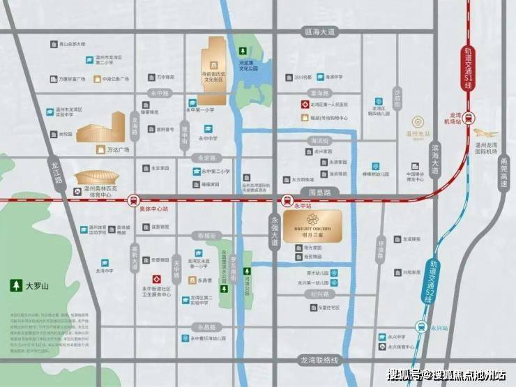 在温州城市东进方向上,以明月兰庭所在的S1线永中站这里为原点,向外辐射,涵盖空铁枢纽片区和万达商圈。