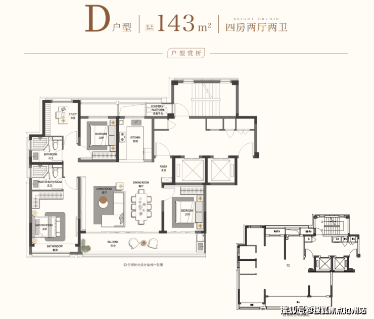 建面约143㎡户型,四开间朝南,满足多元空间需求。