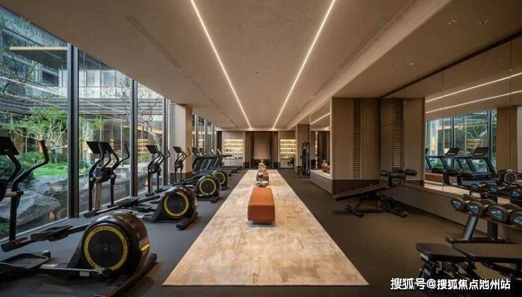 无论在健身房或瑜伽室,还是在会所会客,透过整面的巨幅落地玻璃,下沉式庭院的叠瀑、树影、奇石等都被自然地引入室内。