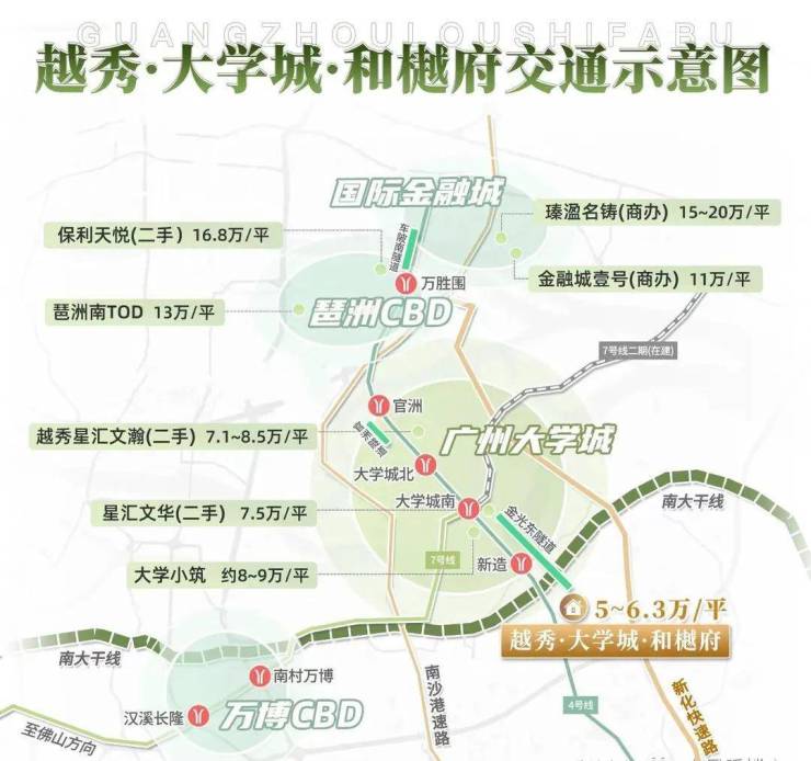 周边有13所高校,从这里出发至万博、琶洲、金融城都非常方便,几大黄金交通线路的开通,使得项目完美实现一步繁华,而且也自带11万方公园,实现了一半公园一半城的社区