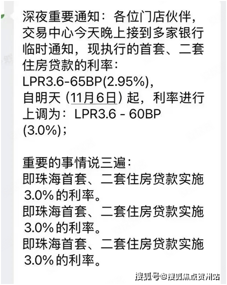 珠海的首套/二套住房贷款利率,自11月6日起,利率进行上调为:3.0%(LPR-60BP)。此前,珠海主流首套/二套住房贷款利率为2.95%(LPR-65BP)。