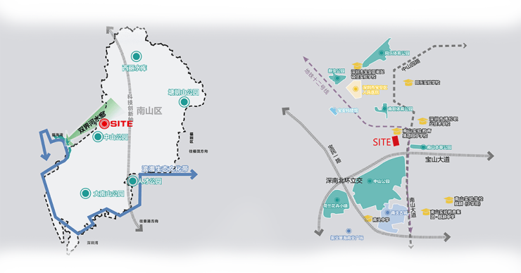 位于深圳南山区中部组团,属于粤港澳大湾区第一发展圈层,是高新技术、文化创意、文脉传承于一体的创新发展片区。场地区域位置优越,周边配套丰富,2KM 范围内有公园、学校、南头古城商圈、医院、地铁等;场地高层视线开阔,可远眺深圳湾。